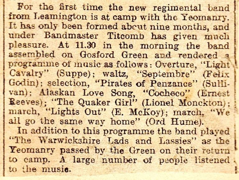 Page 80-81 mentions The Warwickshire Yeomanry Officer’s Mess which was located at the Warwick Arms Hotel, with stabling for 75 horses’ and Trumpeter John SPICER whose horse took fright as the trumpeters were sounding and he fell, striking his head on a kerb outside the Warwick Arms Hotel. He was left partially paralysed and died shortly afterwards. *