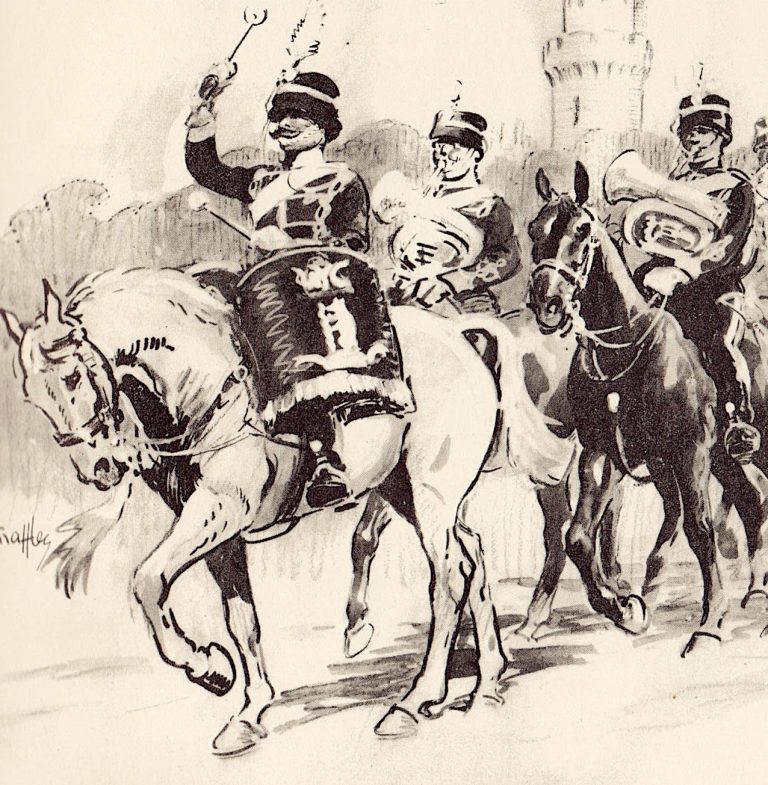 SNAFFLES chose his sketch of the ‘Warwickshire Yeomanry Cavalry – and the Band played on’ as the frontispiece to the book “for it is a far hark back into the golden haze of my