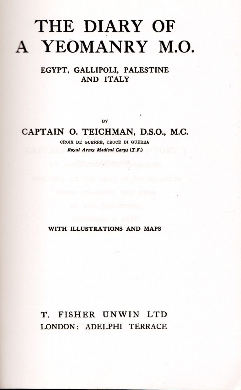 ‘The Diary of A Yeomanry M.O. – Egypt, Gallipoli, Palestine and Italy’ by Captain O. TEICHMAN, D.S.O., M.C., with