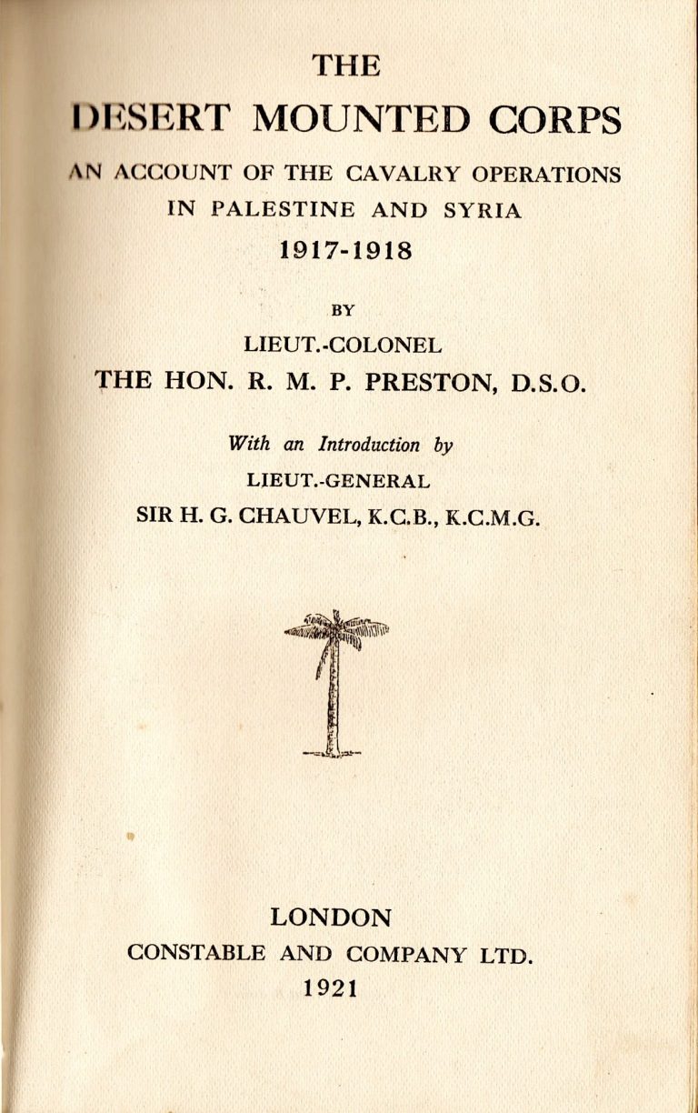 ‘Desert Mounted Corps - An Account of the Cavalry Operations in Palestine and Syria 1917-1918’ by Lieut-Colonel The Hon. R.M.P. PRESTON, D.S.O.