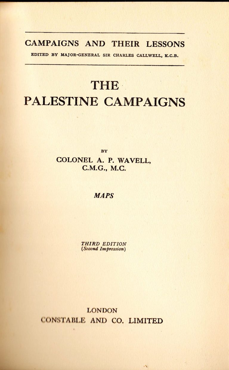 ‘The Palestine Campaigns’ by Colonel A.P. WAVELL, C.M.G., M.C. and ‘Egypt and Palestine Campaign with details of the 1917-18 Operations illustrating the principles of War’ by Lieut.Col. A. KEARSEY, D.S.O., O.B.E., p.s.c.,