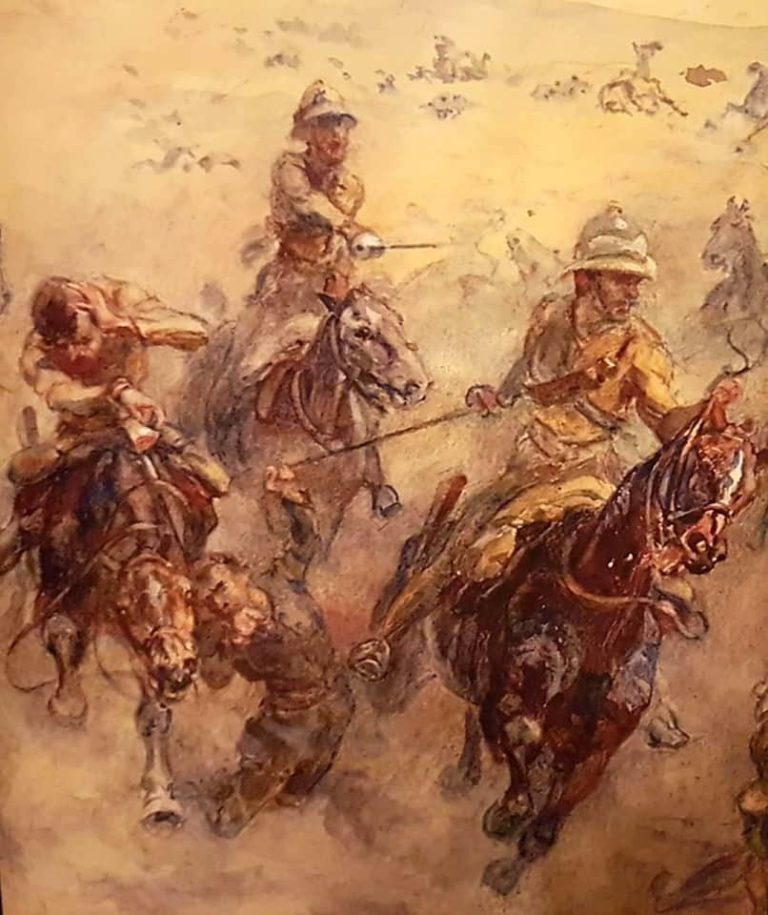 ‘At the moment we were dismounted, giving our horses a breather and attending to some of our recently wounded behind a slight ridge. Our Second-in-Command gave the order to mount, and called out, “Now then boys, for the guns!” Away they galloped, and the
